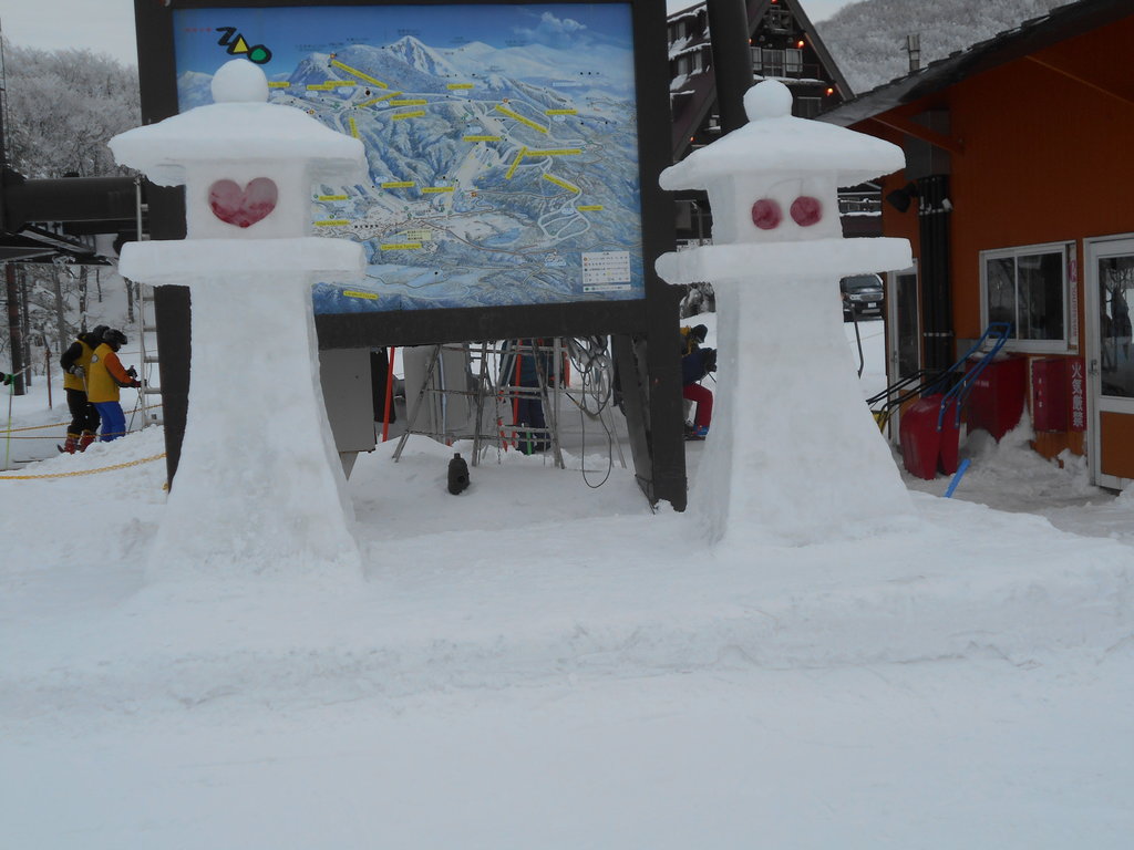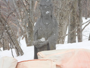ルベール蔵王玄関前・朝7時5度・標高1,200m以上雲の中・曇・無風・地蔵山頂も気温0度・暖かい日です。ハーネンカムコース真ん中2本の真ん中に建立されている観音像です、アルペン大会で女子選手が事故で亡くなり親御さんが供養でお造りになりました!!!