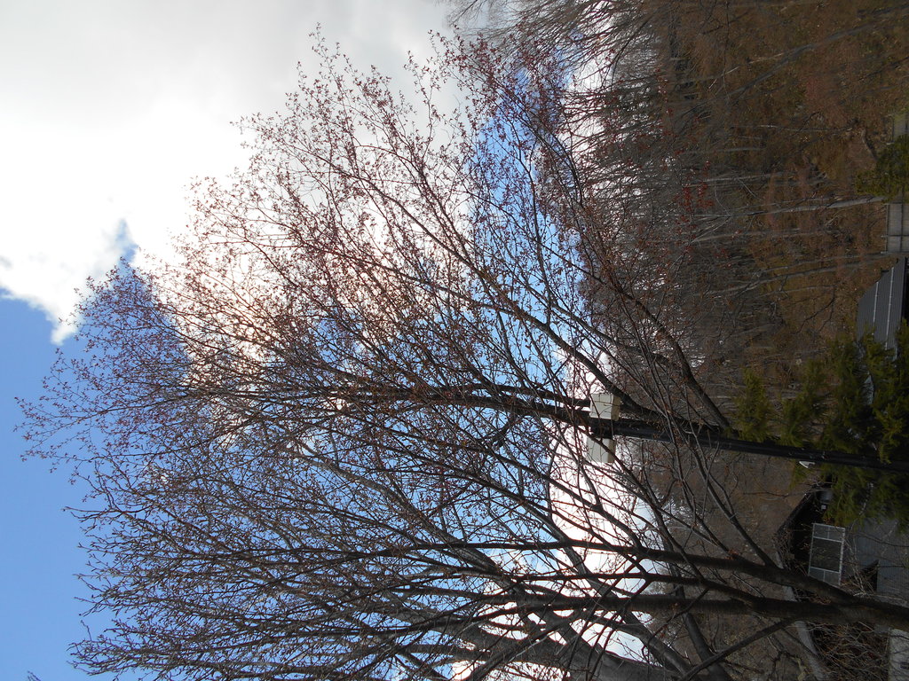ル・ベール蔵王玄関前・朝7時・8度・晴・中風・中央ゲレンデ6コース滑走可・リフトスタッフ雪を運びゲレンデ整備をしてくれています。感謝!感謝!!!明後日5月6日迄6コース滑走出来る様です!!!写真は玄関前の蔵王温泉一番巨木の山桜です!!!DSCN4029