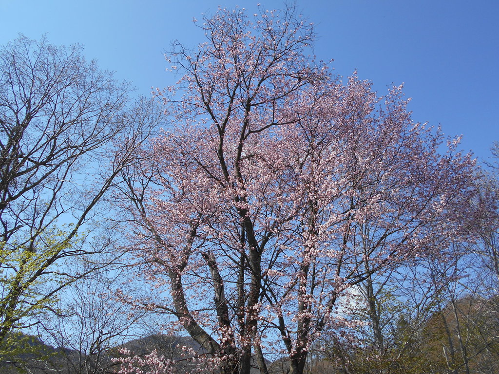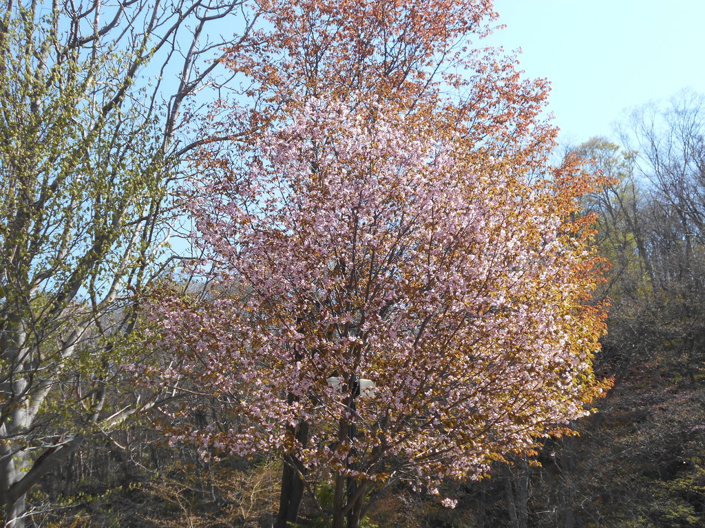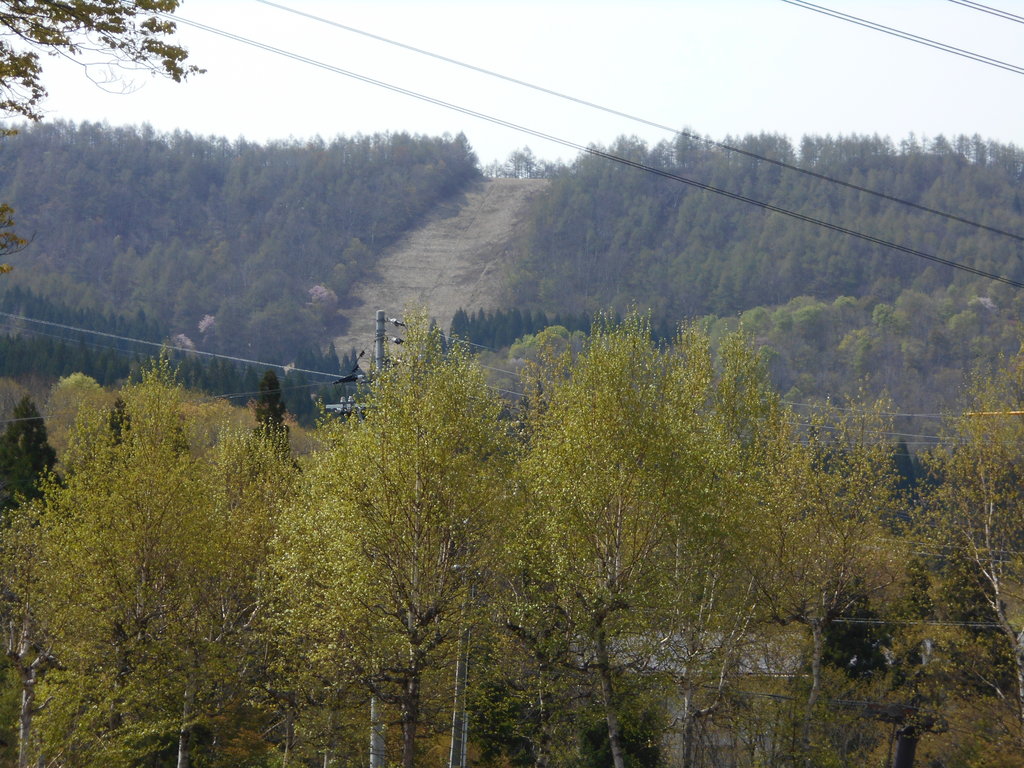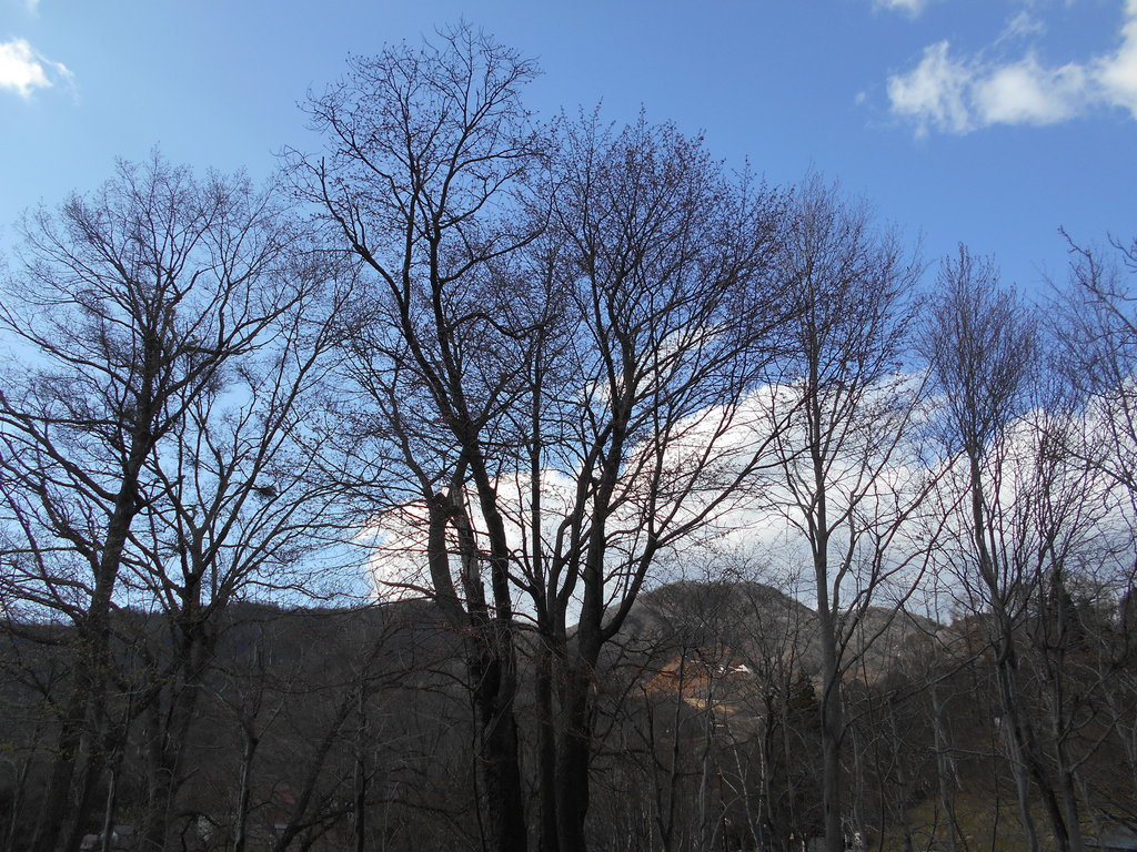ル・ベール蔵王玄関前・朝7時・16度・晴・中風・今日の中央ゲレンデ6コースはバーン硬い雪室で蔵王温泉スキーパトロール隊員も最後の仕事に来ていました!!!龍山の左側の裾野標高1,100m迄落葉した木々の所々が山桜のピンクの花が咲きました!!!