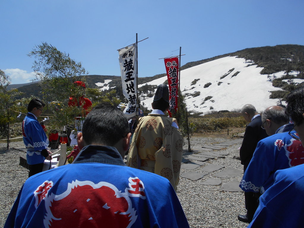 ル・ベール蔵王玄関前・朝7時・15度・快晴・弱風、早朝から春ゼミエゾハルゼミが大合唱!!!地蔵山頂で蔵王地蔵尊様春季例大祭が200名弱の参拝で行われました!!!地蔵山の登山道・木道残雪が多く登山靴で登山する必要があります!!!