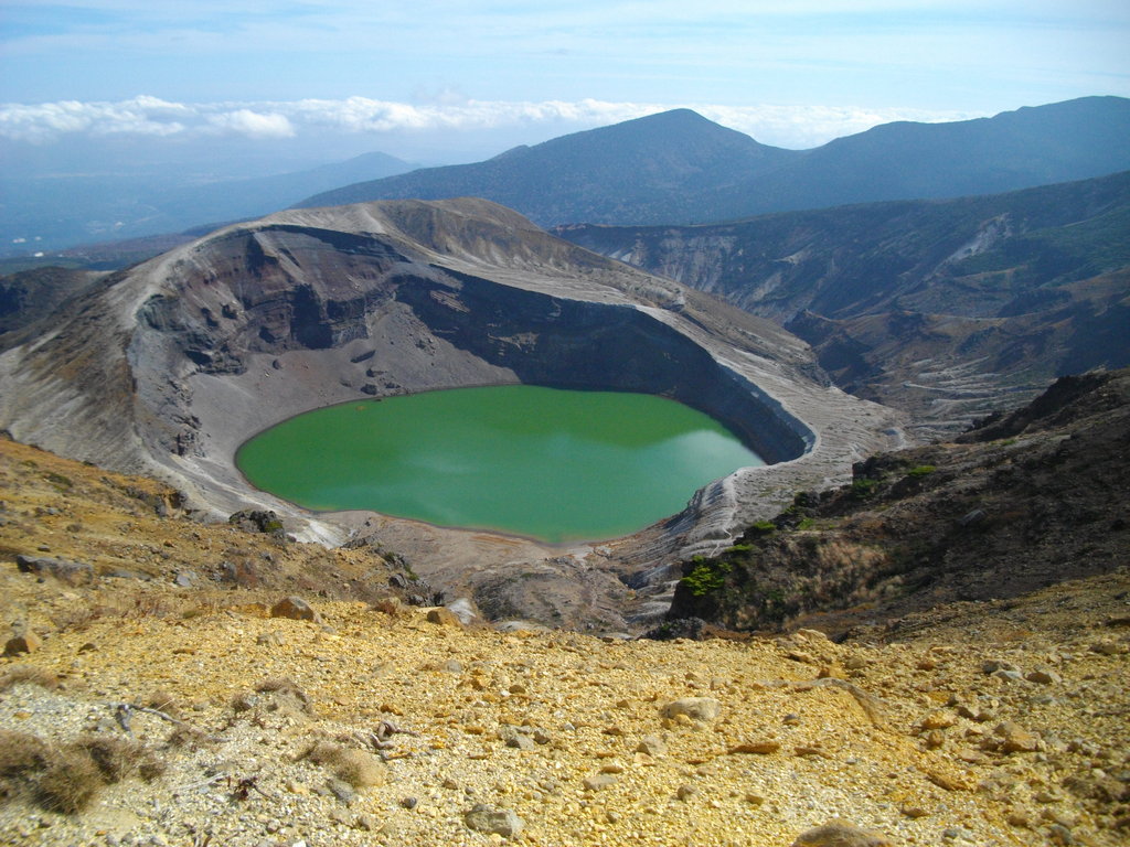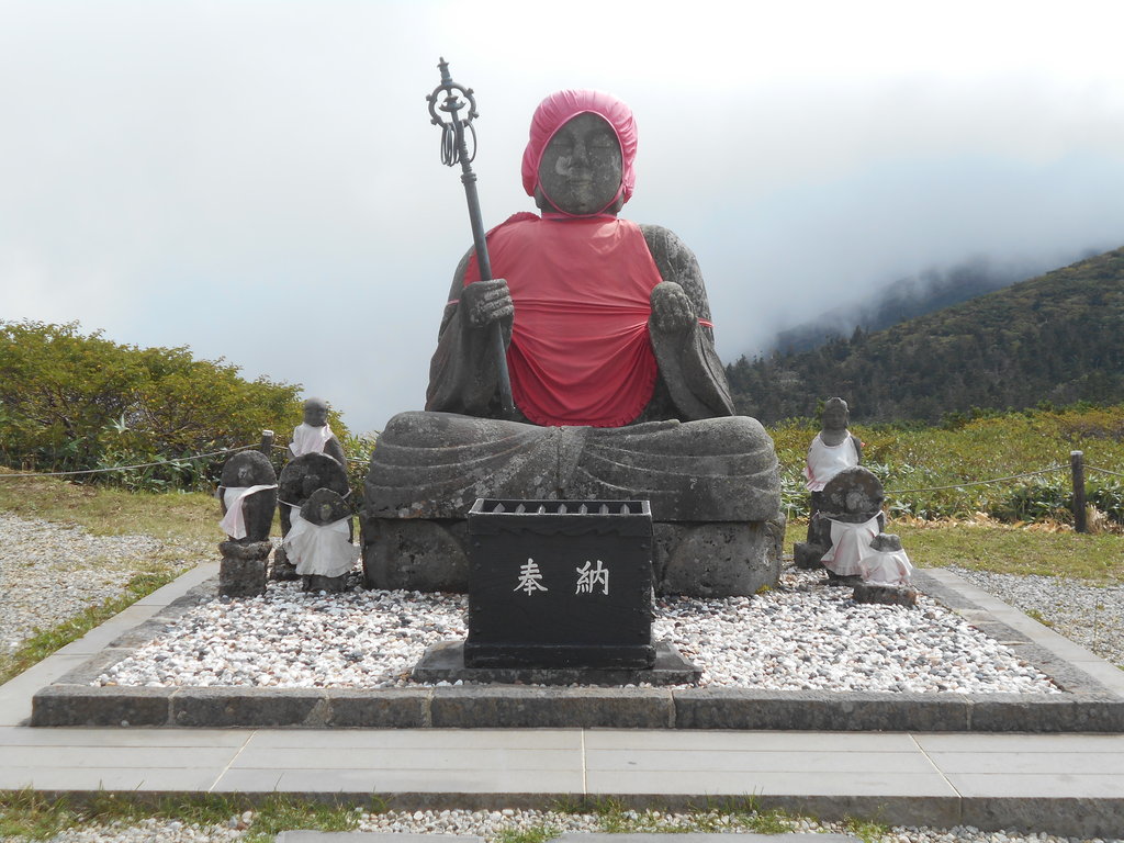 ル・ベール蔵王玄関前朝7時・18度・曇・涼しい風が吹いていました!!!お泊りのお客様蔵王御釜に車で登り蔵王御釜を見に行きましたが濃霧で見れませんでした!!!蔵王温泉観光協会でお釜が見える見えないの現時点の状況を公式ホームページでタイムリーに掲載する必要があります。宮城県関係者と相談し是非実現する必要があります!!!蔵王御釜の写真です。蔵王河童がトレッキングし写した写真です。