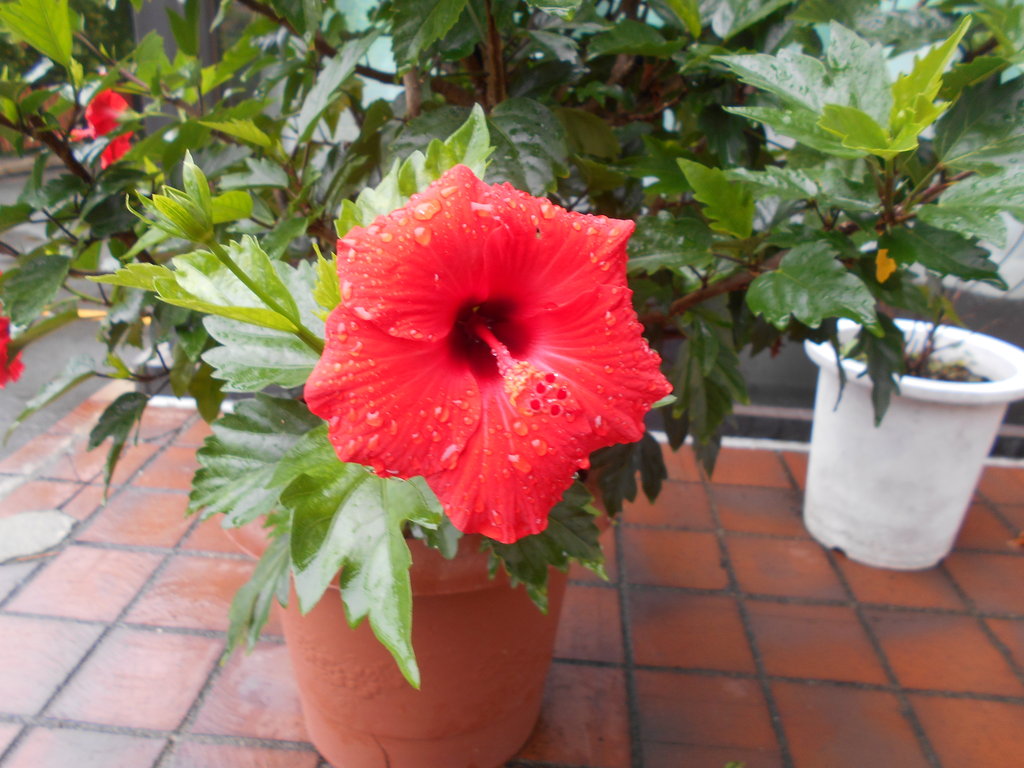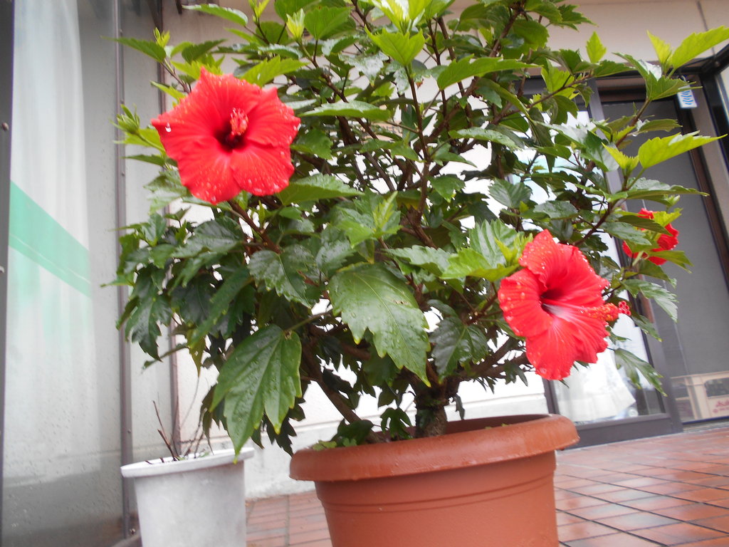 ル・ベール蔵王玄関前朝7時・16度・曇・夏ゼミが全く鳴きません!!!東京のホテルニューオオタニで東京在住山形県人千数百名が集い山形おかみ会が当館禮子女将おかみ会会長始め山形県内各地温泉地女将が十数名華を咲かせに行きます!!!当館女将がそだてているハワイの国花ハイビスカスが数度目の花を咲かせました。今日は5輪咲きました!!!