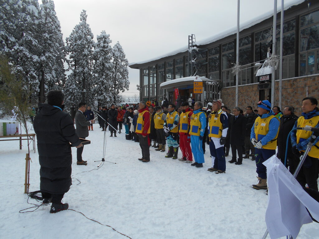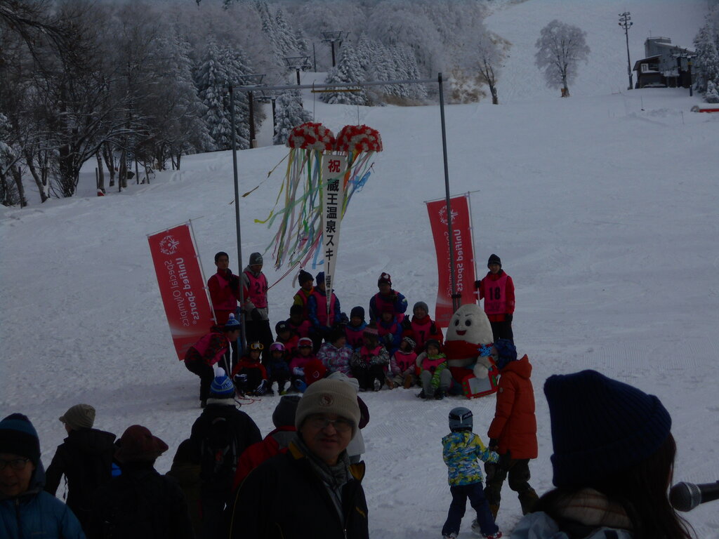 地元小学生とスペシャルオリンピックアスリートの少年がくすだまをわり蔵王のジュッキ―ちゃんもお手伝いをしました。安全スキー指導員の任命を市長が行いました!!!