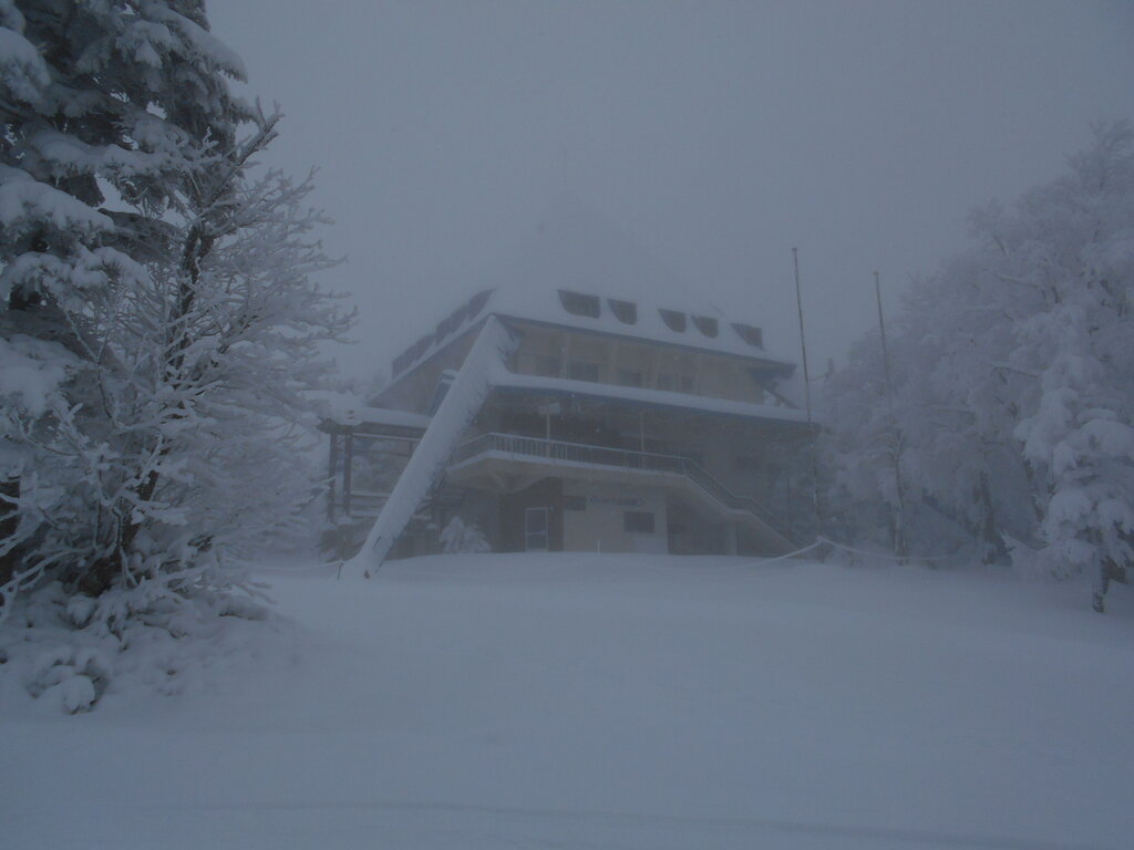 ル・ベール蔵王玄関前・朝7時・3度・雪・濃霧・眼下の蔵王温泉街雲の下・龍山、横倉山も雲の中で視界30m・昨夜酒ミュージアムで神戸から来たオーストリア輸入企業の幹部夫妻の説明でスパークリングワイン・白ワイン11種・赤ワイン3種・ホットワイン1種・グレープジュース1種の試飲会に参加して来ました!!!神戸から来たオーストリア人と奥様!!!