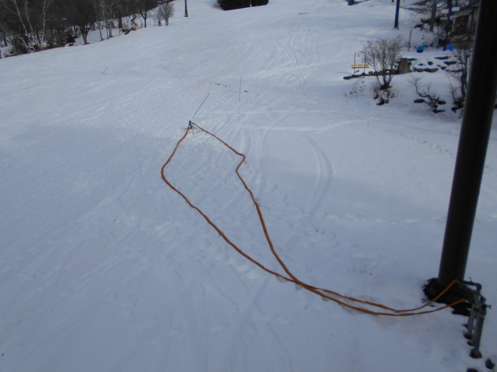 上ノ台の流水を使ってスノーマシンで雪造りします。ゲレンデにホースを伸ばし先端から霧を噴霧してバーンに雪を着けます。