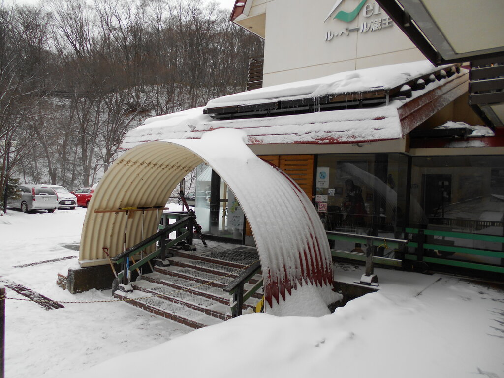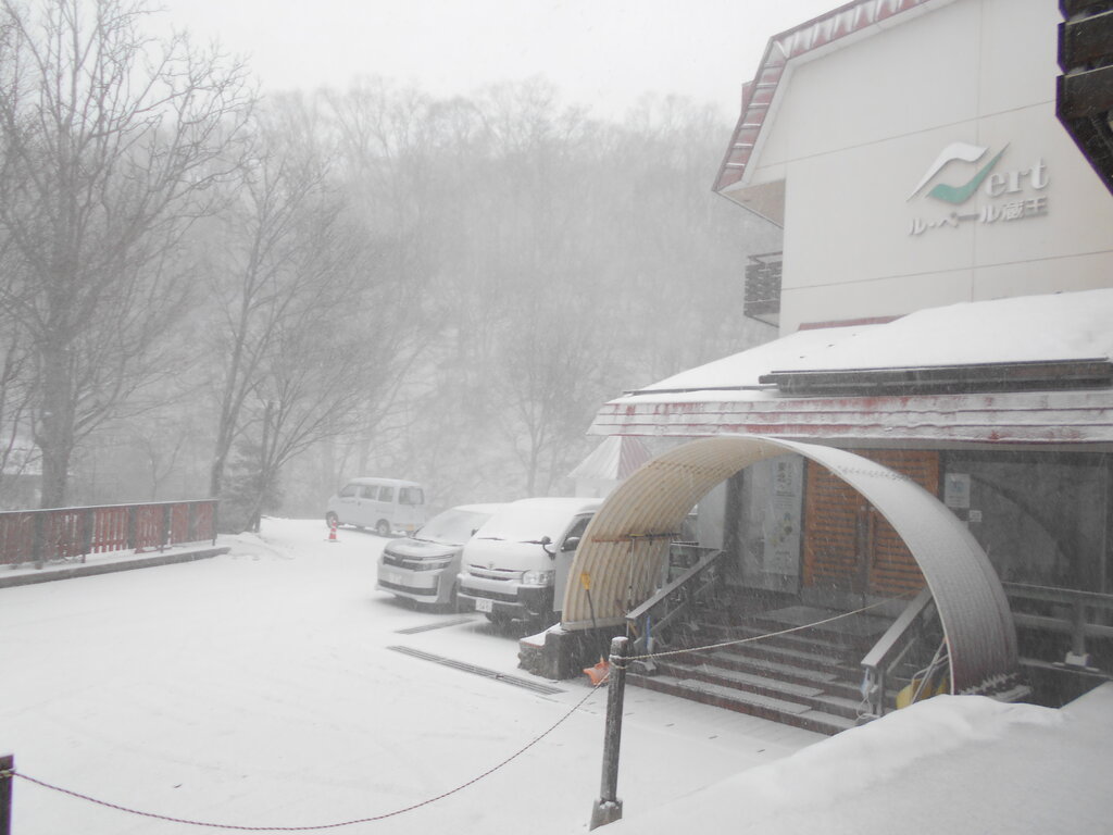 ル・ベール蔵王玄関前・朝7時・-3度・昨夜から3cm降雪・曇・今日夜の講習から指導員研修会が始まります。300名の県外からの指導員を含めた研修会です。2年に1回研修を受ける必要があります。明日12時から蔵王温泉大露天風呂が特別開放が行われテレビクルーが準備状況を放映してくれました!!!