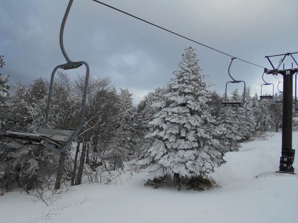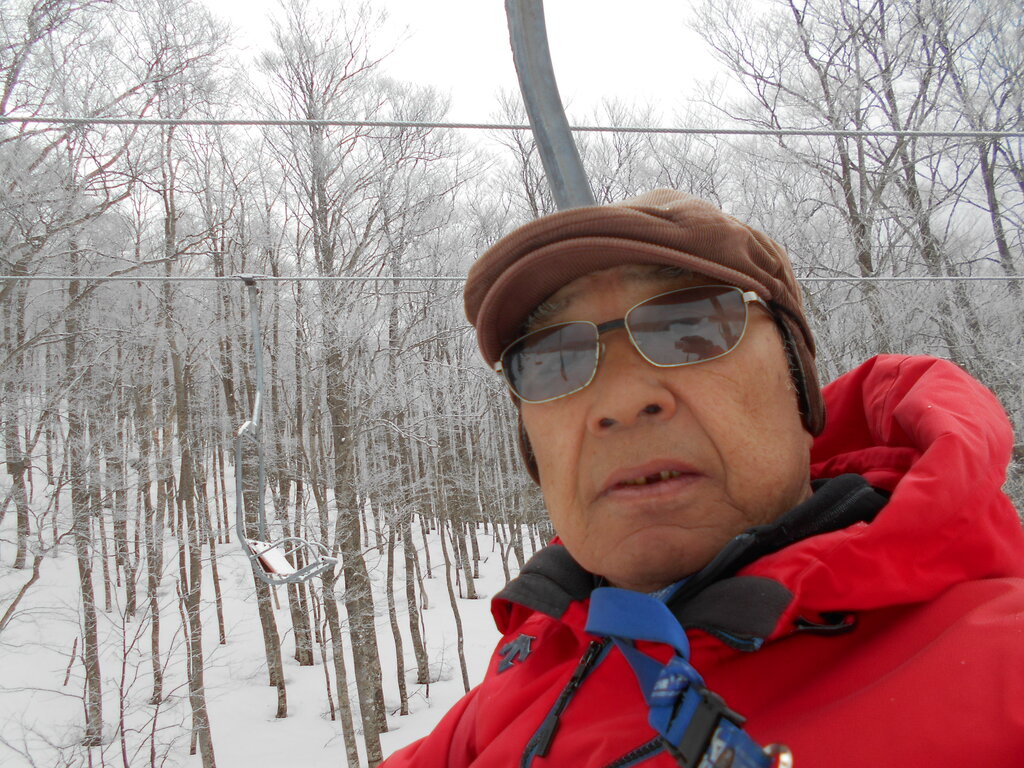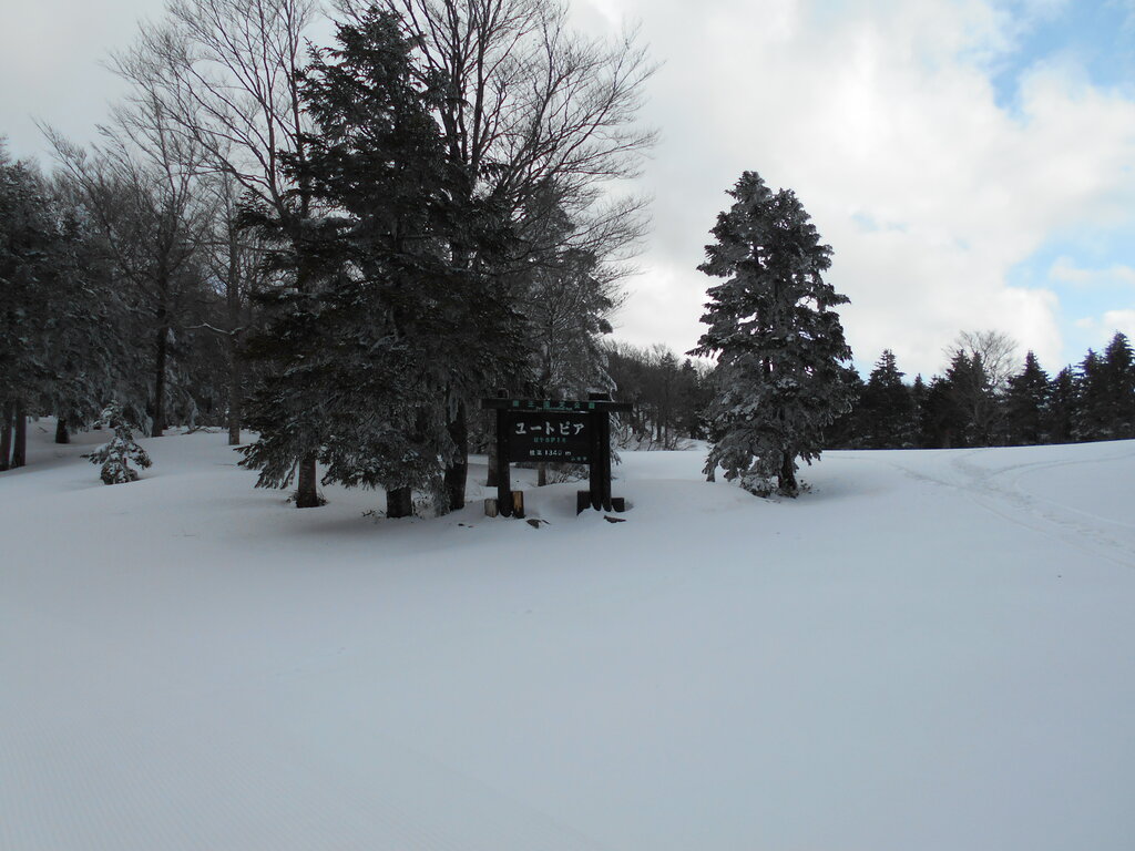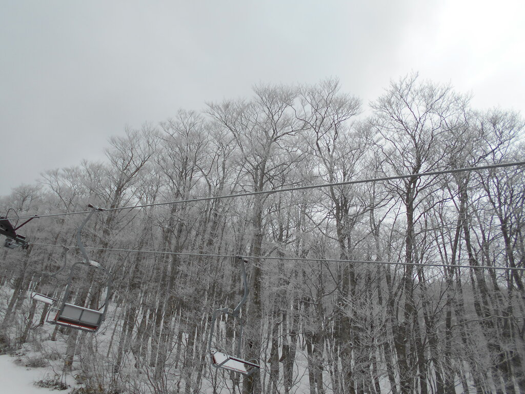 ・ベール蔵王玄関前・朝7時・3度・曇・一面積雪数センチ・無風・中央ゲレンデ・−3度・曇・中風・硬いバーンに新雪。ピステン圧雪全面フラット2月の感じ・スキーヤー・ボーダー高速回転で滑走!!!標高1,250mブナ林霧氷が咲いています。地蔵山も真っ白!!!