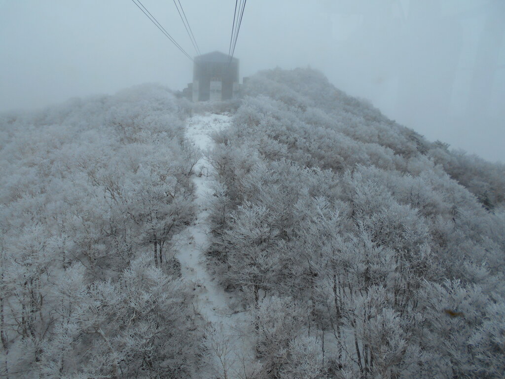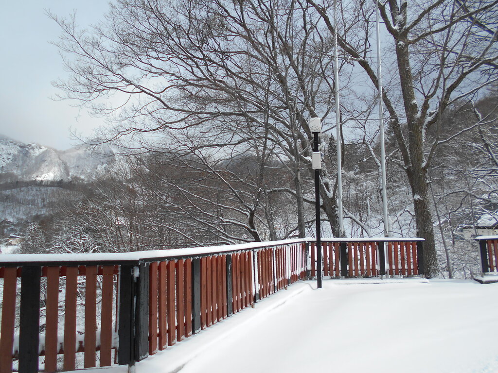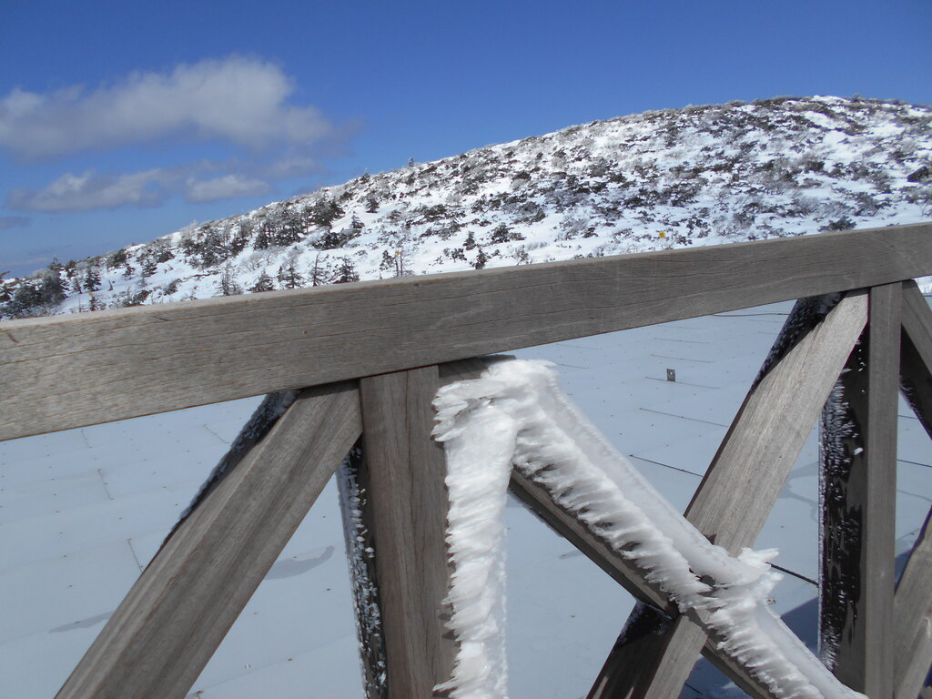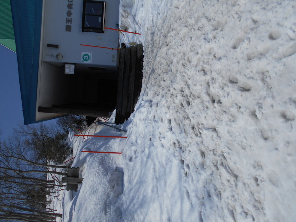 ル・ベール蔵王玄関前・朝7時・5度・晴・鳥兜駅・+2度・中央ゲレンデ7コース滑走可能・鳥兜駅の階段5段雪の上まだ10段雪ノ下!!!地藏山山頂白く霧氷が出来ていました!!!