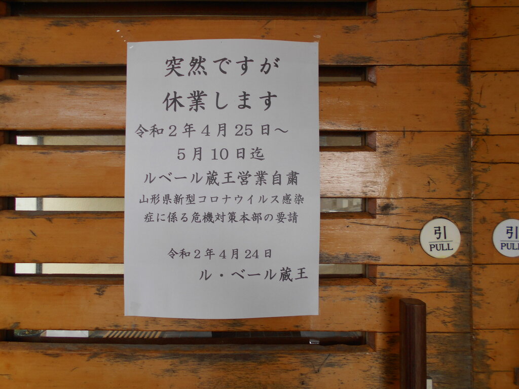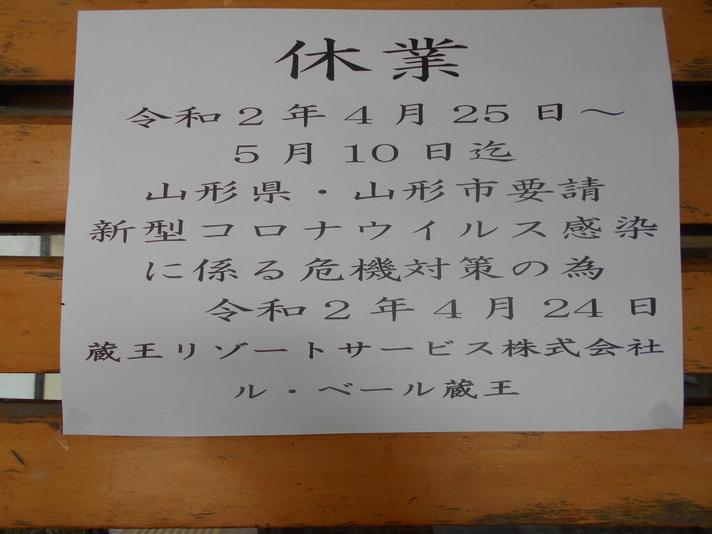 ル・ベール蔵王玄関前・朝7時・4度・晴・地蔵山頂駅−4度・晴・突然蔵王ロープウェイから臨時休業のお知らせのFaxが送信されました。「新型コロナウイルス感染増加による、緊急事態宣言の全都道府県拡大で、山形県からの休業要請により弊社蔵王ロープウェイは、4月18日(土)から当面の間、臨時休業といたします。ご不便をおかけいたしますが、昨今の情勢を鑑み、何卒ご理解くださいますようお願い申し上げます。【臨時休業】2020年4月18日(土)〜当面の間」営業再開につきましては、決まり次第ご案内申し上げます。 蔵王ロープウェイ((株))