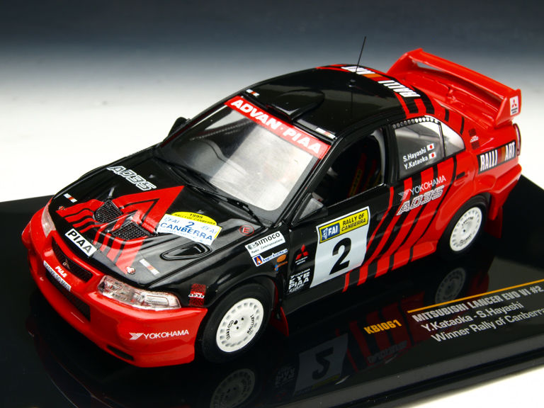 三菱のWRC最強時代に輝くエボVI、グループA仕様のワークスカーでマキネン車とADVANカラーの片岡車、グループN仕様の田口車の第一弾リリース陣に、ターマック仕様のタイヤとホイールを装備したマキネンの優勝車2種、通好みのターマック仕様テストカー、そしてロードカーバージョンの4種をラインナップした第二弾リリースモデルが加わり、全7種すべてが発売になりました。