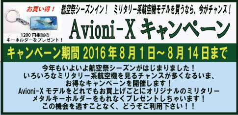 2016年8月1日(月)〜 8月14日(木)までの間にAvioni-Xモデルをお買い上げの方にもれなく人気の自衛隊メタルキーホルダー(1,200円相当)を1個プレゼントいたします。