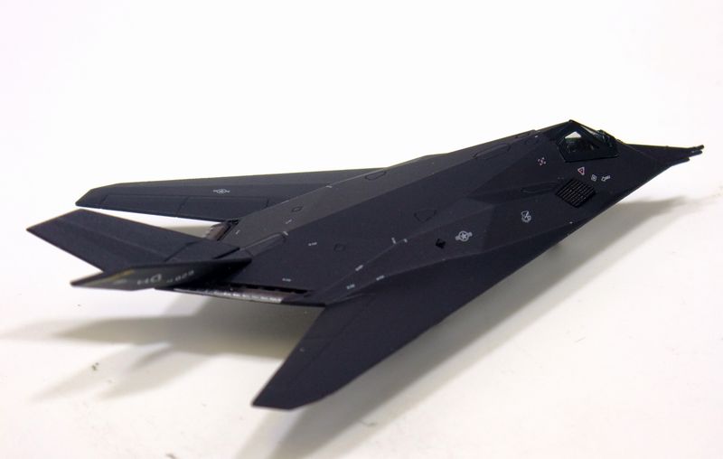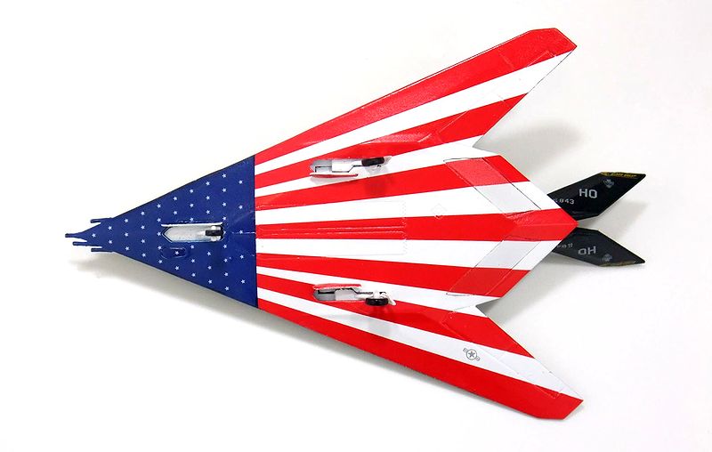 さて、今回はおまけがあります。先日紹介しましたF-117『ステルス』のバリエーションサンプルが届きました。ひとつはF-117の定番ともいえる下面いっぱいに星条旗を描いた機体、そしてもうひとつは通好みなノーマル塗装機です。
