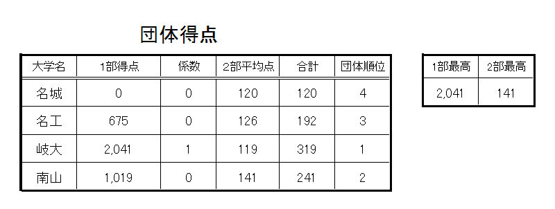 一部競技 (周回速度競技) 選手と 二部競技(基本操作)選手の成績を掛け合わせた総合点で団体成績を決めています。