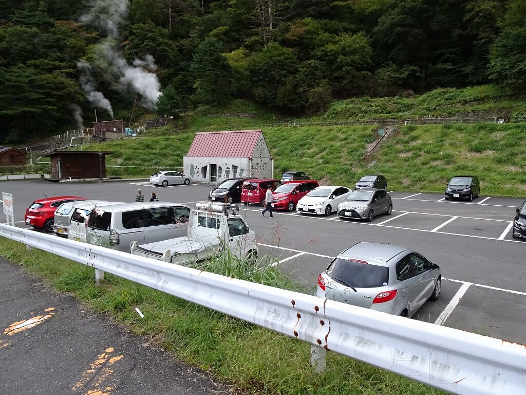 驚くことに、駐車場の隅から温泉の蒸気が吹いている。