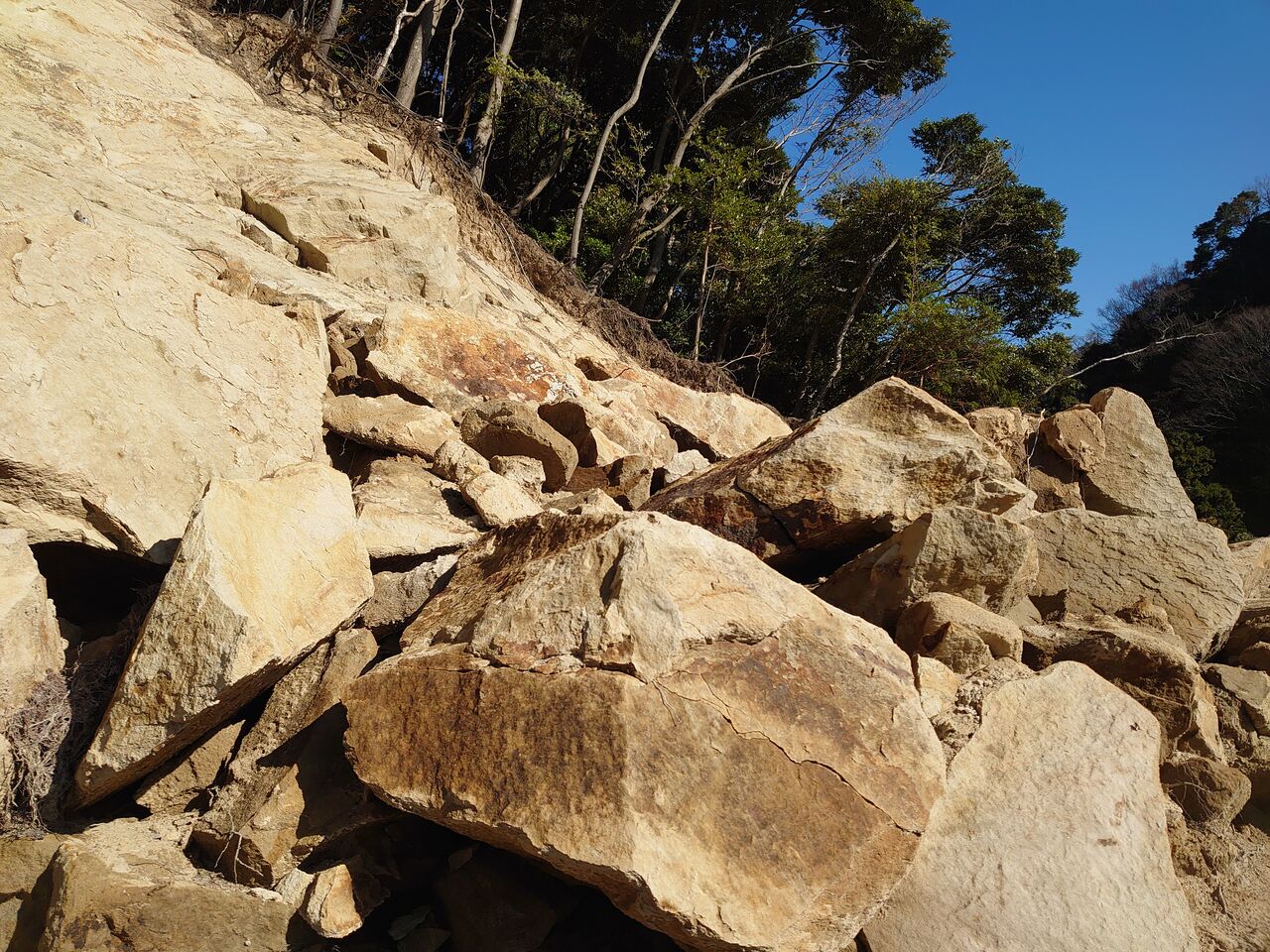 おお、右の足元の先は石切り場の跡だ。 落ちたら死ぬな。