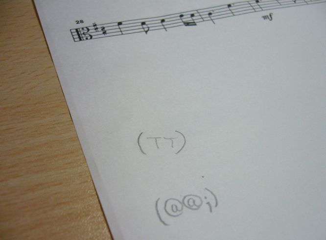 まず、退屈したチェロの子がわたしの譜面に落書き → (T-T)