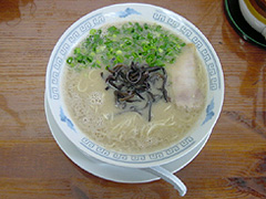 ラーメンは、チャーシュー・ねぎ・のりとシンプルです。スープは豚骨くささが鼻にきますが、以外に食べるとこってりしていません。若干薄い気がしますが、テーブルにある辛子高菜や紅しょうがと一緒に食べるとちょうどいい味になります。チャーハンは安い割には結構おいしいと思います。なお、替え玉も100円と良心的です。