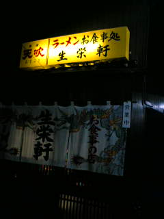 先日、夜寂しい飲食街の一角にあるちょうちんを出しているラーメン屋に入りました。以前から気になってはいたのですが、入るのに躊躇していました。この日は酔った勢い(?)でこのラーメン屋「生栄軒」に入りました。店内は狭く既に5人お客さんがいて満杯でした。