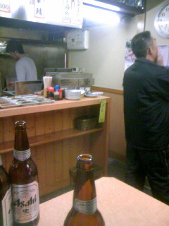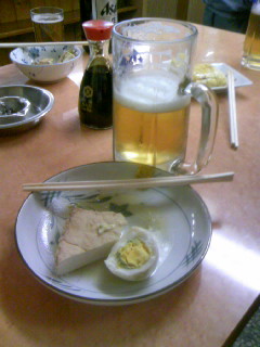 メニューは、生ビール390円・発泡酒(1缶)200円・焼酎180円(水割り・お湯割)があります。ただし、焼酎は銘柄も選べず麦・芋のみです。ただし、焼酎ダブル(たしか350円)という変則ワザがあります。この店のいい所は、瓶ビール(大ビン)が390円で飲めるところです。発砲酒ではなく、キリンラガー・スーパードライが飲めるので、これは安いと思います。