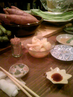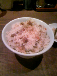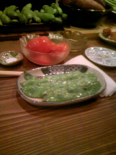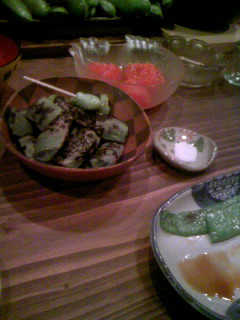 ツマミとして、トマトサラダ・大きいエンドウ豆を茹でたモノ・大きいそら豆(?)をさやごと焼いたモノ等季節の野菜を頼みました。この店に来て「野菜はこんなに美味いのか!?」と実感します。また、野菜でビールと焼酎ガンガン進み・・・「酒に野菜がこれほど合うのか?!」と教えられたのはこのお店です。