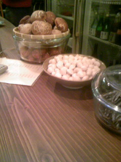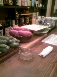 以前10月23日、10月8日のブログでも紹介してましたが、久しぶりに行きました。カウンターにはしいたけ、ぎんなん、アスパラ、さつまいもなど野菜が並び、棚には結構珍しい焼酎も並んでいます。今回も生ビール(モルツ390円)から飲みました。