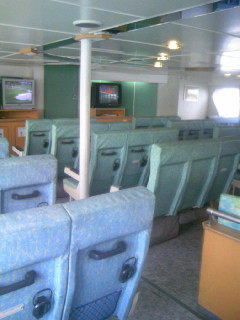 博多港から志賀島まで、西戸崎・大岳経由で所要時間35分のミニ航海でした。船内はソファ風と通常の座席の2種類で、テレビもあり、短時間の割には居心地のいい船内でした。博多港を出てしばらくすると、高速船らしく心地よいスピードで航海し、この日は天気も良かったのでベタ凪で揺れはほとんどありませんでした。