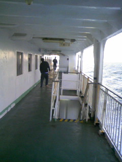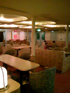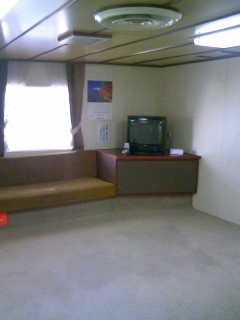 この船には、スイートルーム・デラックスルーム・1等・2等寝台等船室も充実していますが、軽食コーナー・売店、シャワールーム、大型液晶テレビを供えたラウンジ、自販機コーナー等公室の充実には特筆すべきものがあります。なお、ホームページで紹介されたカラオケルームがペット同伴ルームに変更されていました・・・乗船後、さっそく売店でつまみを買い、自販機でビール・チューハイを買い込み、ラウンジにて一人で一杯やりながらくつろぎました。