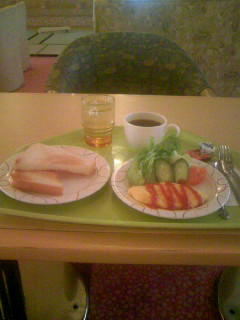 早朝宇久の後、小値賀・青方と停まっていき、次々と乗客が降りて行きます。そんな中、私は毛布にくるまりウトウト寝ていました。まともに起きたのは7時過ぎで、ラウンジの軽食コーナーで朝洋定食650円を頼み、食べました。トースト・オムレツ・サラダ・コーヒーとオーソドックスな内容ですが、1200トンクラスの船でちゃんとした料理が食べれるので、満足です。