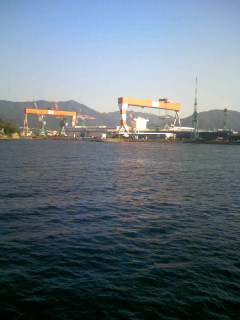 奈良尾港を出た後、1時間程2等船室で一眠りし、その後長崎到着までデッキで潮風を感じながら、ぼおっと海を眺めていました。心地よいスピードと快晴の中ベタなぎの海で快適です。三菱重工業長崎造船所が見え、16時30分長崎港着。