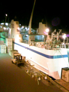 岸壁には、既に対馬・比田勝行の九州郵船のフェリーげんかいと今回乗る五島行の野母商船「太古」がいました。フェリーげんかいは、「これが夜行で対馬・比田勝まで行くの?」というしょぼさです...でも、1回乗ってみたいと思ってたりします...野母商船の「太古」は、23時半発にかかわらず、21時半から乗船出来ます。私も乗船手続きをしたらすぐ、対馬行を待っている乗客を尻目にすぐ乗り込みました。