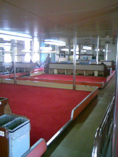 朝食後、デッキに出てしばらく景色を見ていましたが、島々の間を縫いながら、きめ細く梶をとりながら航行していきます。天気は快晴、海はベタなぎです。2等船室に戻ると、ほとんどの乗客が降りてガランとしていました。そんな2等船室を客室乗務員が毛布やゴミをさりげなく片付けていました。すごい気配りです...