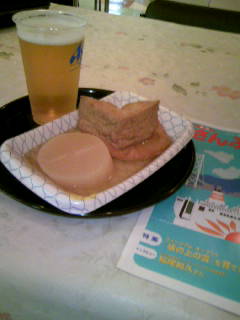 乗船後、さっそく浴室に行き、一風呂入りました。風呂に入りながら、50代の男性と同じく50代のドライバーさんと雑談をしました。一風呂入った後、売店で生ビールとおでんで一杯やっていると、先程浴室で一緒になった50代の男性とばったり会い、しばらく雑談しました。