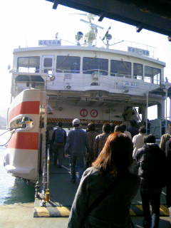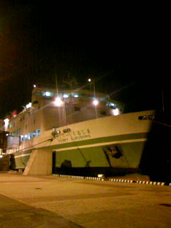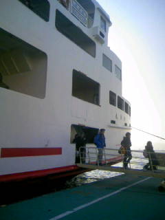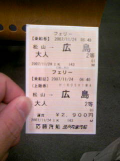 肝心の船は発船10分前に着きました。600トンクラスの船で、そんなに大きくありません。この松山〜広島航路は、石崎汽船と瀬戸内海汽船の共同運航で、フェリーと高速船の2種類があります。フェリーだと2等2900円ですが、高速船は6300円もします...今回は迷わずフェリーを選びました。