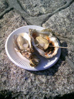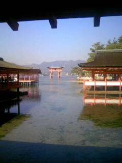 宮島桟橋から厳島神社まで、鹿がうろつき、お土産屋・食べ物屋が軒を連ねます。途中、揚げ紅葉まんじゅう(130円)を買って食べました。揚げたてでおいしかったです。厳島神社は世界遺産にふさわしく風格のあるきれいな神社でした。帰りに焼がき(2個300円)を海を見ながら頬張りました。