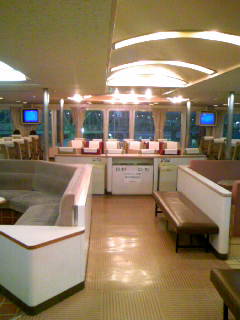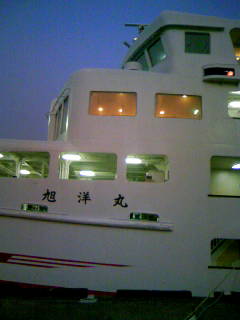 今回乗船するフェリーは、石崎汽船の旭洋丸です。乗船時、若い女性の客室乗務員が案内してくれました。旭洋丸の客室部分は、2階構造で、1階部分に座席・座敷の2等船室と喫煙室、売店、自販機、トイレがあります。売店には、お菓子類・酒・パンはもちろん弁当も売られていました。2階部分は昔「1等」だった2等船室があります。元1等と言っても、直角のソファが並び、中途半端なラウンジのようでイマイチでした...。