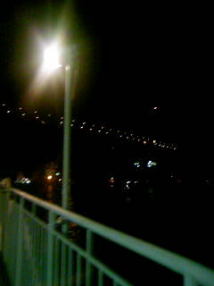 22時30分に関門海峡を通過する為、10分前に船外デッキに出ました。天気は快晴。月がきれいです。ちょうど関門海峡を通過中で両岸の街明かりが見えます。クライマックスは、関門大橋通過で、海から関門大橋をくぐって見るのは、非常に迫力があります。