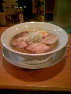 来たラーメンは、透き通った醤油スープにチャーシュー・細切りした白ねぎ・焦がし玉ねぎ(?)のチップの入った具と細めんの組み合わせでした。食べた感想は、「スゴクうまい!」でした。麺はシコシココシがあり、チャーシューはトロトロ、スープは繊細かつ美味い!言う事無しです・・・