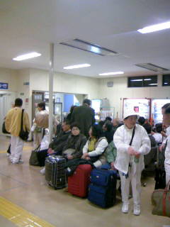 小倉駅北口から国際展示場の寂しい自動歩道を通り抜け、歩いて12分程関西汽船のフェリー乗場に到着しました。このフェリー乗場1階建の小さな、周りには何もありません...しかし、フェリー乗場の中は、お遍路さんの団体や旅行客、ドライバー等でごった返しています...しかも、乗船待ちの車の列が、フェリーくるしま前に連なっています。
