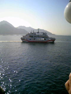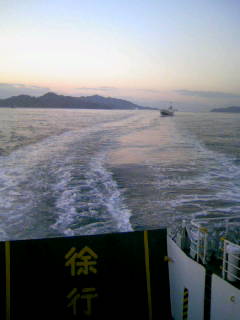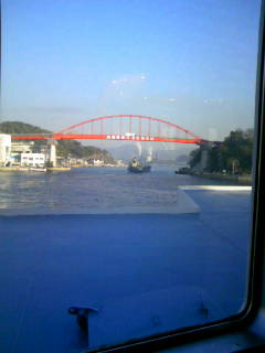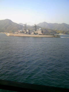 今日は天気も良く、ベタなぎです。フェリー旭洋丸は、瀬戸内海の島々を縫いながらゆっくり航行して行きます。途中、松山7時発の高速船「スーパージェット」にゴボウ抜きされました...しばらくウトウト寝ていましたが、途中非常に狭い島間をくぐり、海上自衛隊の護衛艦や松山行や近距離フェリー・高速船「スーパージェット」とすれ違いました。定刻9時5分より早く広島港到着。