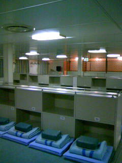 21時から乗船開始。このフェリーくるしまの客室部分は、2階構造になっており、1階部分に売店・浴室・特等・1等・2等船室があり、2階に2等船室の大部屋があります。なお、この船の売店は、充実しており、おでん・うどん・焼きそば・ポテトフライ等食べ物類が充実しています。