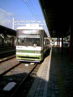 そして、西広島から宮島口行に乗換えました。市電?なのに何故か3両編成で車掌が乗ってます。しかも乗用車等と一緒に走らず、専用軌道を駅間は短いですが、かなり飛ばしています。なお、車内は連休で紅葉シーズンと言う事もあり、目茶苦茶混んでいます。終点宮島口の1つ前の駅では乗客が乗り切れず、「積み残し」まででました...宮島口には、11時過ぎに到着。