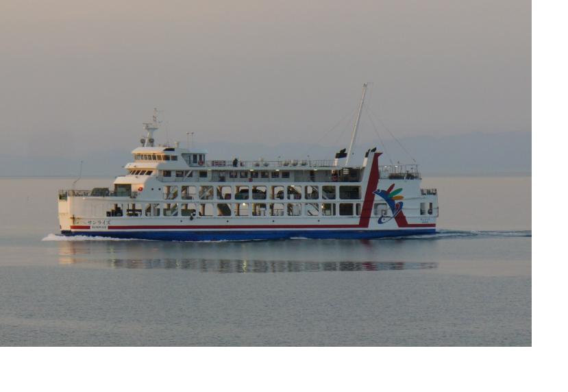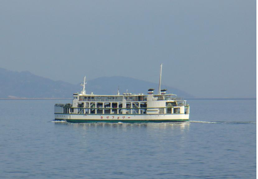 うどんを食べ終えた時、船室は座席がほぼ埋まる程混んでいました。車のお客さんが多いようです。出港後、ずっと外部デッキで船を追いかけるカモメと海を眺めていました。途中、第十有明丸とサンライズの2隻とすれ違い、写真を撮りまくりました。