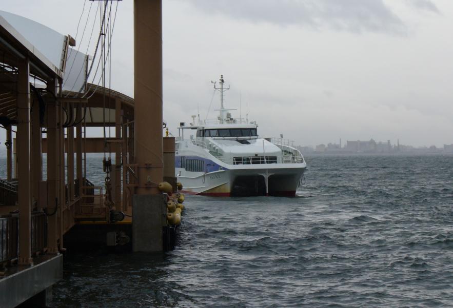 降りしきる雨の中、韓国・釜山を結ぶジェットフォイル「KOBBEV」をまず撮影。