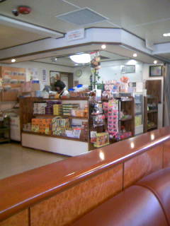乗船したフェリーは、第八有明丸で、船内は座席がズラッと並び、売店とうどんコーナーがあります。さっそく船天うどん400円を食べます。うどんの上に船の形をした魚の擂り身の天ぷらがのっています。