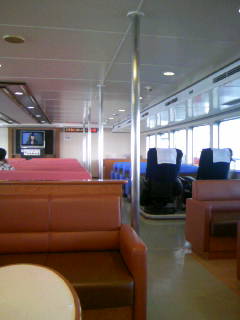 今回はまだ午前中という事もあり、思いきって福岡市営渡船で西戸崎まで乗りました。今回乗船した船は、「きんいん2」高速双胴船です。船内は、海の中道行の船「オーシャンライナー」欠航に伴い、市営渡船で海の中道に行く家族連れが乗っていました。