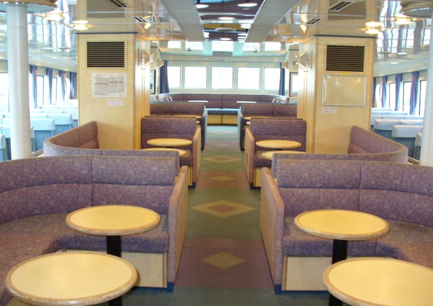 船内は市営渡船にしては、きれいで快適です。出港後、船内から停泊している「ニューかめりあ」とすれ違ったクルーズ船「マリエラ」を撮影しました。