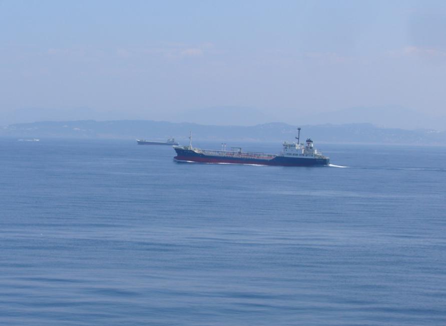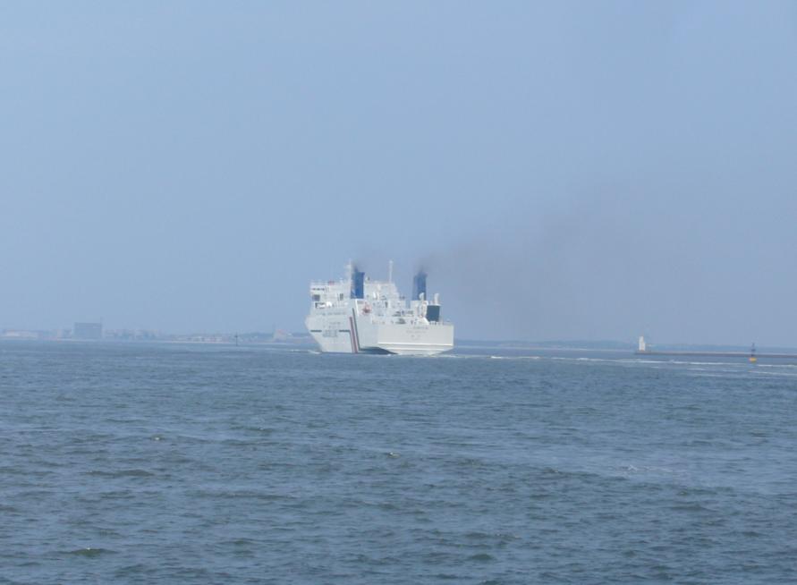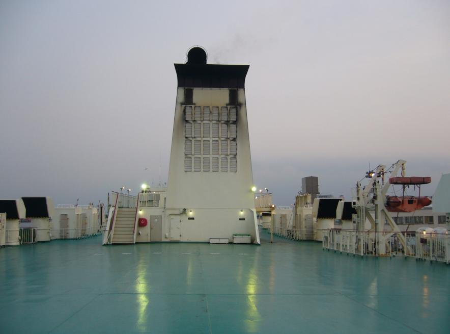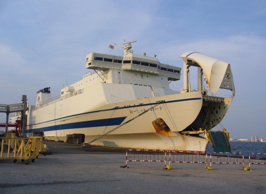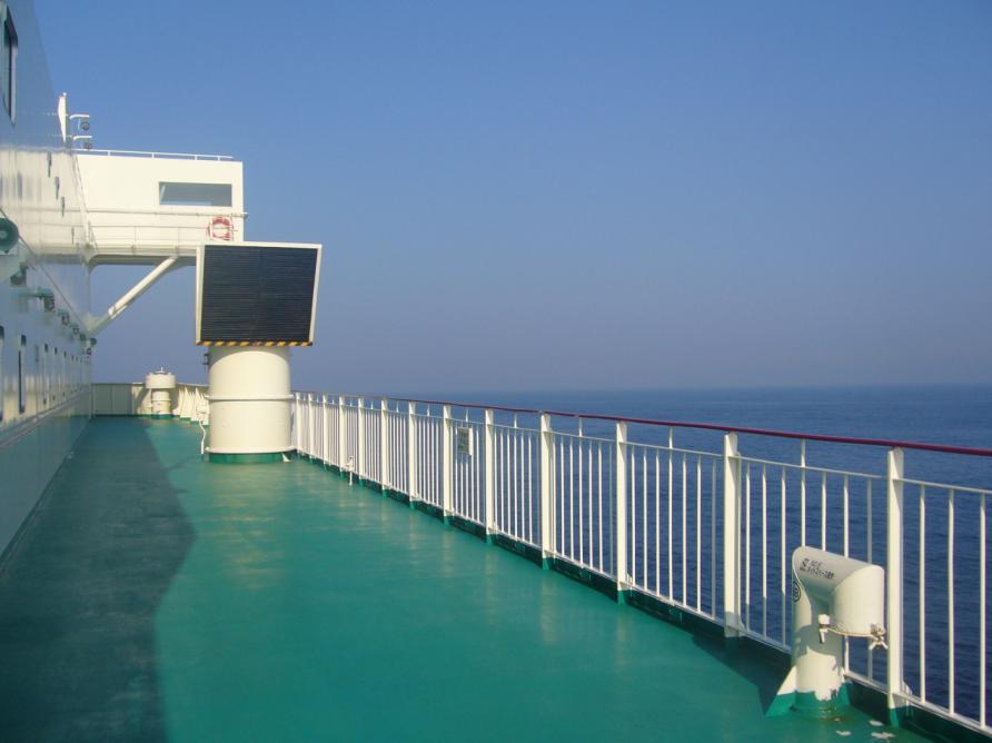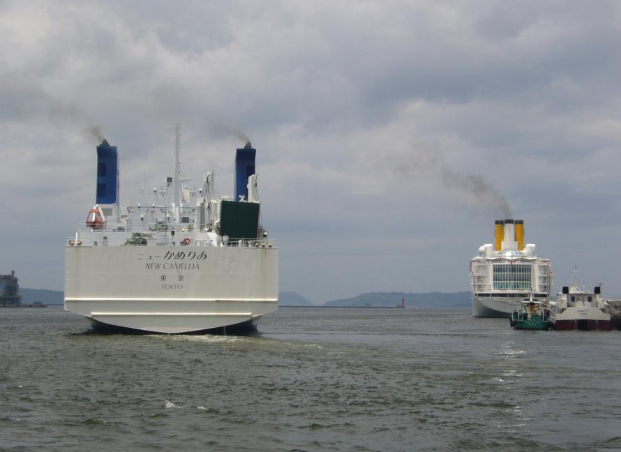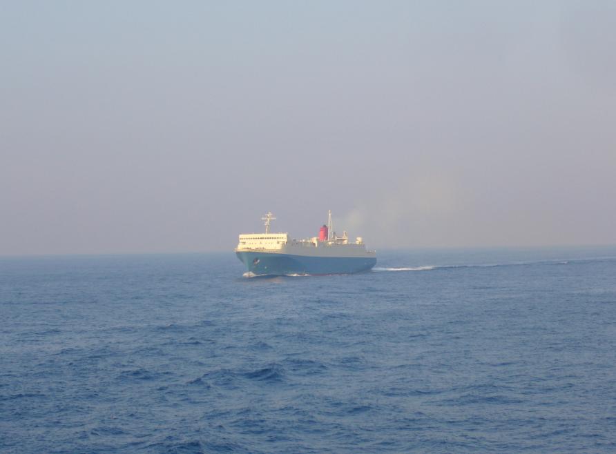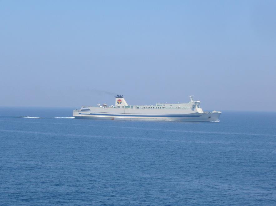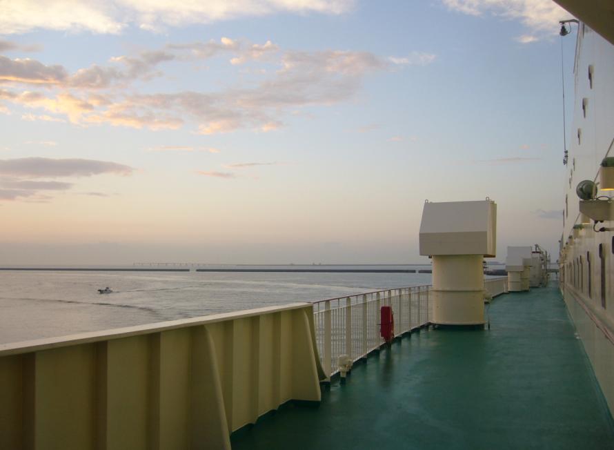朝食後、身支度を素早く済ませ、外部デッキですれ違うRORO船を撮影しました。夏なので、あたりは既に明るくなっています。