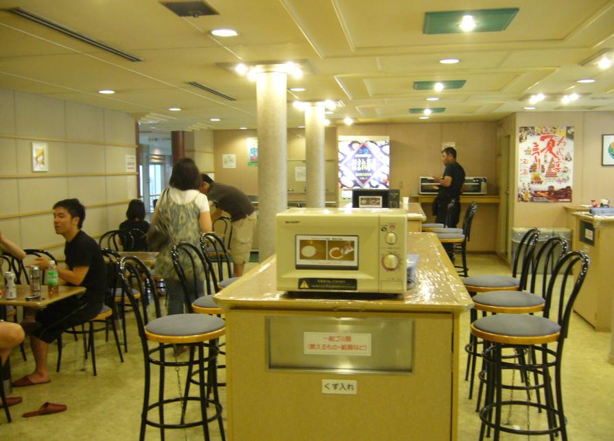 このおーしゃんのーすは、「カジュアルフェリー」と言ってレストランはありません。しかし、パブリックスペースは充実しており、レストランの代わりにコンビニampmのスパゲティやチャーハン等の冷凍食品自販機やリゾット、カレー等レトルト食品が全て1品200円で食べれます。200円で食べれる物には定価420円の生姜焼丼とかもあります。