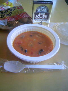 朝食はまたオーシャンプラザで食べました。自販機でレトルト食品「魚貝のかにトマトクリームリゾット」と船に乗る前に買っていた菓子パンでした。朝は朝で朝食を食べるお客で賑わっています。