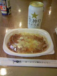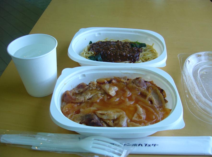 夜7時過ぎ、ようやく沈む夕焼けを外部デッキから見た後、オーシャンプラザで夕食を食べました。これで、船内4回目の食事です。今回は、ampmのミートスパゲティとレトルトのマイタケのデミグラスソースリゾットを選びました。2品で400円!安いです...。ほまれ寿司は、次回乗船時のお楽しみにしました...。